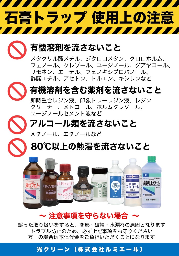 歯科様の衛生環境向上のお手伝いをしている光クリーンとしては「これは真逆の事をしている」と思い、歯科様の流し台は借りず、腐敗臭の心配もいらない「石膏トラップ交換サービス」を開始いたしました。